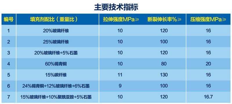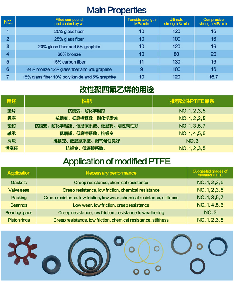 改性聚四氟乙烯制品選用填充聚四氟乙烯樹脂經模壓、車削加工而成。懸浮聚合聚四氟乙烯樹脂與各種填充劑經高速混合得到改性樹脂。適合與聚四氟乙烯混合的填充劑有高目數(shù)玻璃纖維、碳纖維、銅粉及潤滑劑(石墨、二硫化鉬等),其已在生產中廣泛應用。同傳統(tǒng)聚四氟乙烯相比具有更高的壓縮強度、耐磨性、導熱性和抗蠕變性等諸多優(yōu)點。